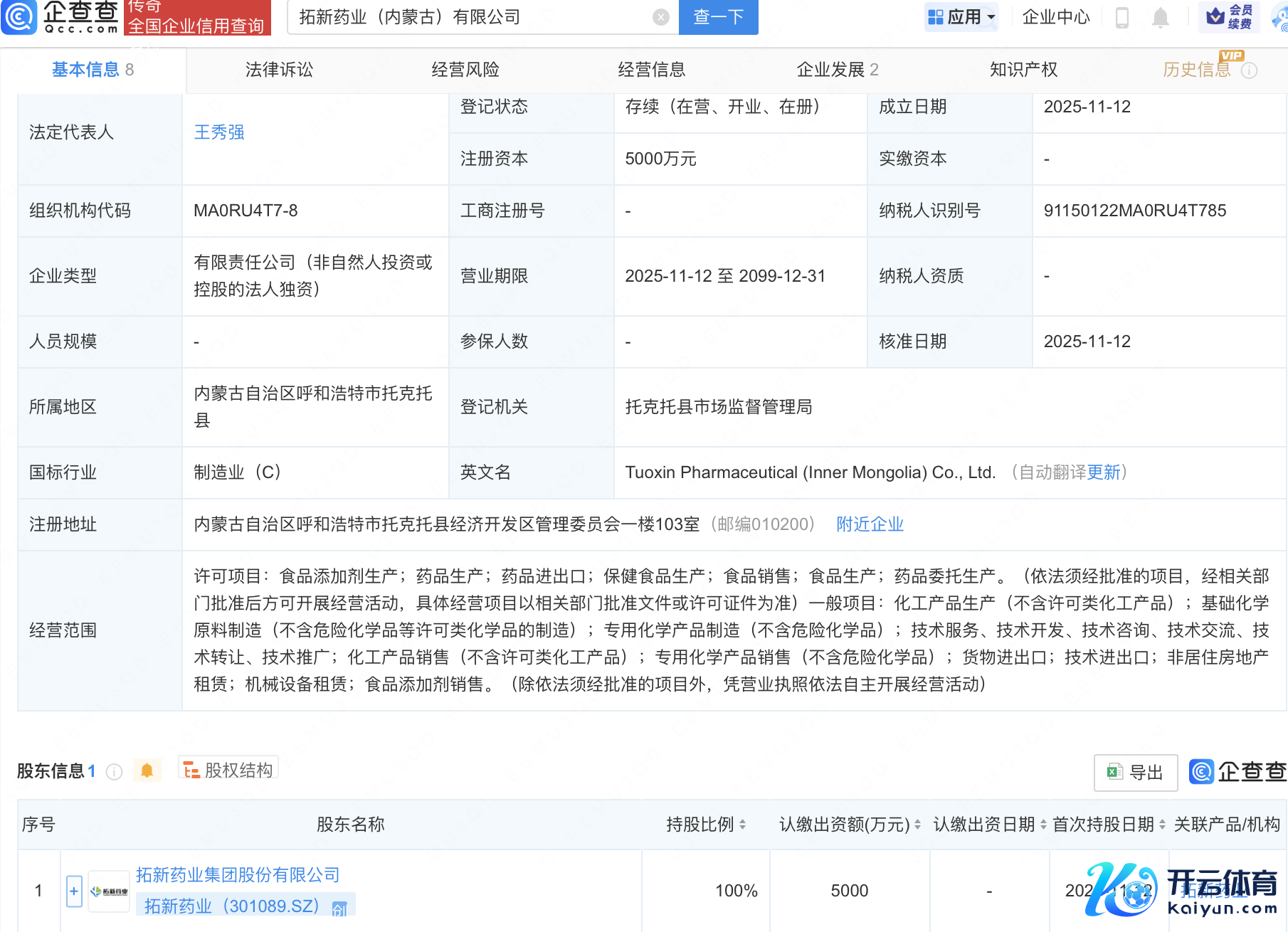近日,拓新药业(内蒙古)有限公司诱骗,注册本钱5000万元,倡导范围包含:食物添加剂坐蓐;药品坐蓐;药品收支口;保健食物坐蓐;食物销售等。企查查股权穿透清晰,该公司由拓新药业(301089)全资抓股。